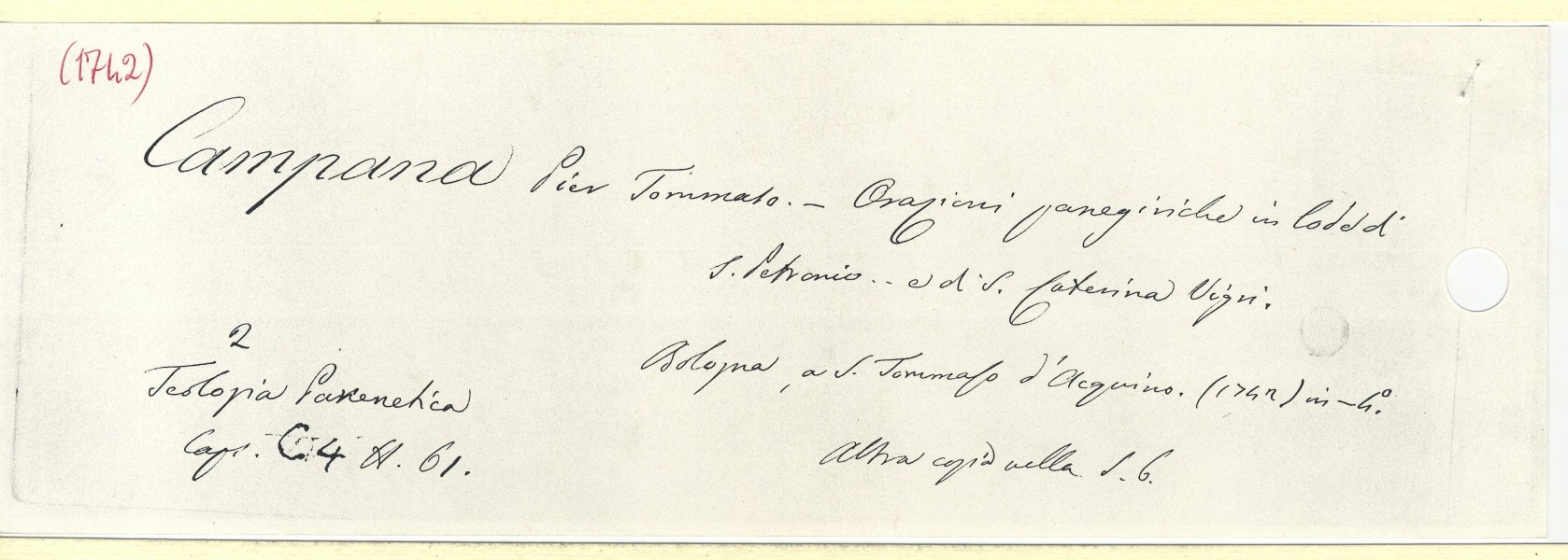 Scheda n. 5534 Anno: 1742 - Tipografo: Pisarri Ferdinando (Es. n. 1) | <indietro avanti > |