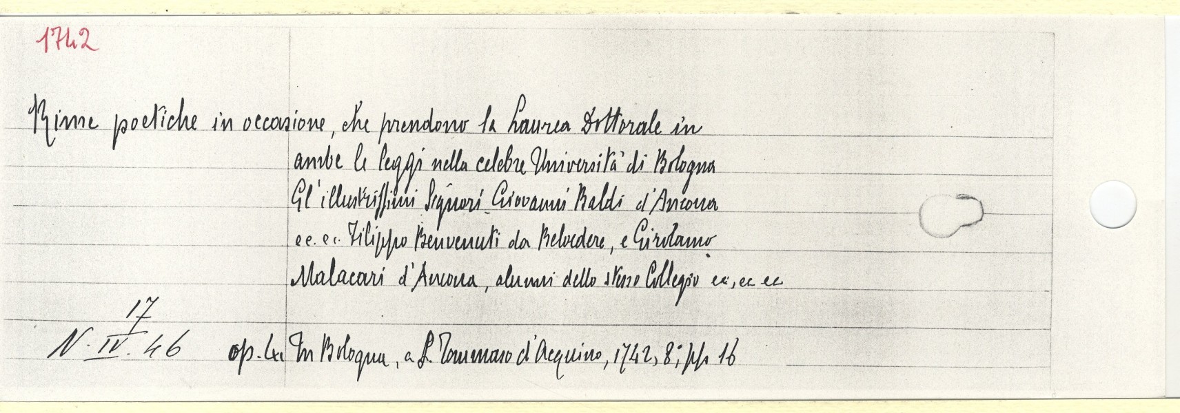Scheda n. 5544 Anno: 1742 - Tipografo: Pisarri Ferdinando | <indietro avanti > |