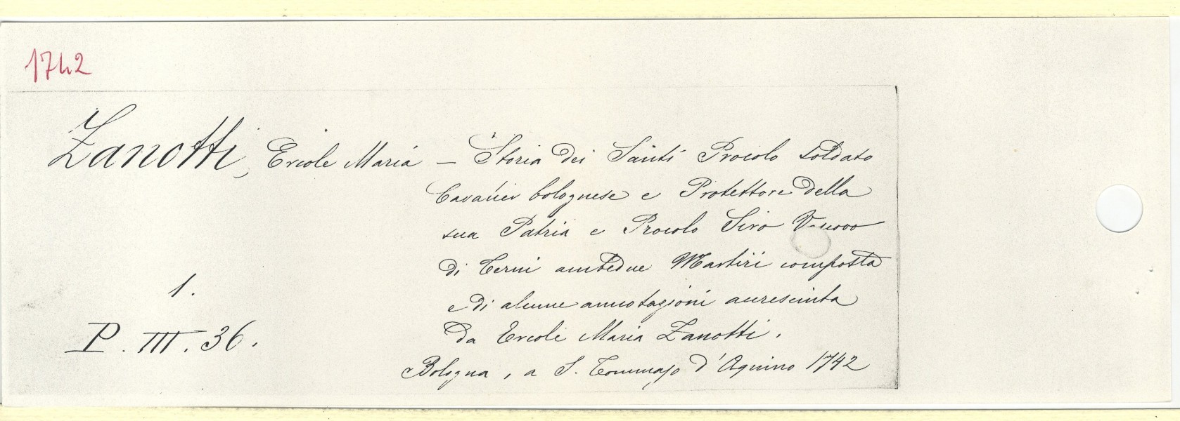 Scheda n. 5550 Anno: 1742 - Tipografo: Pisarri Ferdinando (Es. n. 3) | <indietro avanti > |